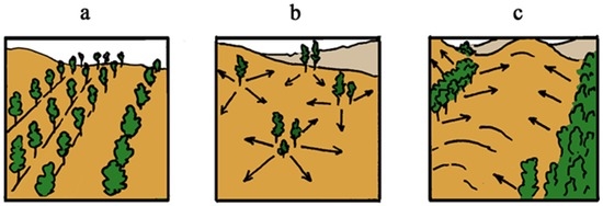 The comparative analysis of plant cover distributions in the orthophotographs from 1970 and 2014 (Figure 6 and Figure 7) made it possible to identify the three modes of forest cover increase presented earlier (Figure 14). Anthropogenic forest regeneration was characterized by the simultaneous appearance of woody vegetation (mainly windbreaks) (Figure 14a). Natural forest regeneration was determined by identifying particular forest segments or patches in the 1970 photos and then locating them within forested stands in the 2014 photos. In places where there were sparse forests or separate trees, forest advancement could proceed in all directions from each group of trees or isolated trees (Figure 14b). It was thus assumed based on Figure 5 and Figure 9a that this is the manner by which the largest blocks of forests in the Iowa study area were formed. In the case of the forest expanding outward from the boundaries of dense forest present at the start of the study period, frontal advances of forest boundaries took place (Figure 14c).