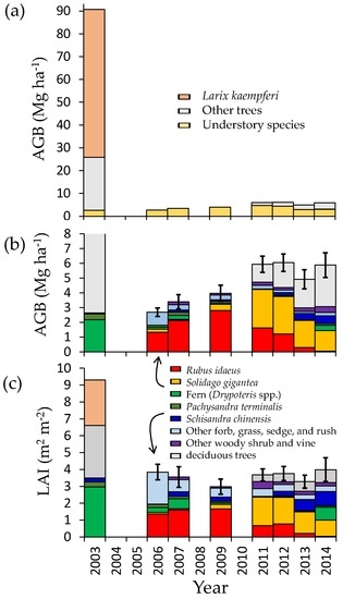 Annual changes in (a) aboveground biomass (AGB); (b) AGB classified by species; and (c) leaf area index (LAI) at peak-growth period classified by species before and after disturbance. Error bars in (b) and (c) represent 1 standard error of total understory AGB (solid, n = 10), total AGB (grey), or total LAI (grey). Data before disturbance were obtained from earlier studies [2,36,37,38]. Standard errors in total AGB and LAI were calculated by the law of error propagation.