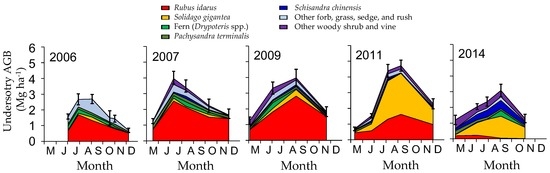 Disturbance and the following succession drastically altered the understory species composition (Figure 1b). Before disturbance, two fern species of Dryopteris crassirhizoma and Dryopteris expansa dominated, accounting for more than 80% of total AGB [38]. After canopy loss, Rubus idaeus took the place of the fern species, accounting for more than 60% in AGB until 2009. Thereafter, an invasive species, Solidago gigantea dominated instead of Rubus idaeus. After 2012, following the population increase of overstory species, the AGB of both Rubus idaeus and Solidago gigantea decreased considerably. In 2014, as a result, the AGB of Solidago gigantea became half of its peak, and Rubus idaeus almost disappeared. Dryopteris spp. and Schisandra chinensis (Turcz.) Baill., a deciduous woody vine species, increased corresponding with the increase in overstory biomass. The seasonality of understory AGB changed with elapsed time after the disturbance (Figure 2). Peak biomass was observed in July or August when Rubus idaeus dominated (2006–2007), but was observed in early September when Solidago gigantea dominated (after 2011) (Table S5).
