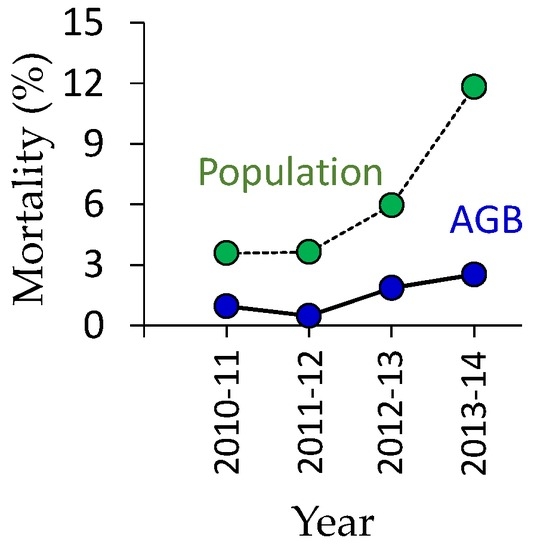 The mortality of overstory trees was evaluated based on population and AGB from the ratio of the numbers of dead trees to all living trees, and the ratio of dead AGB to all living AGB, respectively.