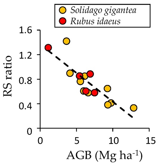 A significant (p < 0.01) linear relationship was found between the RS ratio and AGB of Rubus idaeus (n = 5) and Solidago gigantea (n = 10) communities (Figure 4). The regression line is expressed as: