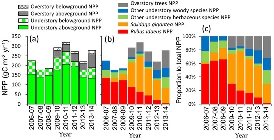 Annual net primary production (NPP) of understory species fluctuated around 200 g·C·m−2·year−1 until 2009; it then increased to 272 g·C·m−2·year−1 in 2010–2011 (Figure 5a). Although Rubus idaeus NPP was greatest by 2009, the NPP sharply decreased, and Solidago gigantea NPP increased (Figure 5b). Through the regeneration of deciduous trees, understory NPP (mainly Solidago gigantea) decreased to 189 g·C·m−2·year−1 in 2013–2014. In spite of the increase of overstory NPP from 48 g·C·m−2·year−1 in 2009–2010 to 90 g·C·m−2·year−1 in 2013–2014, total NPP did not increase after 2011 because of the sharp decrease of understory NPP. The contribution of the overstory to total NPP increased from 17% (2010–2011) to 32% (2013–2014) (Figure 5c). Total belowground NPP accounted for 14%–32% of the total NPP during the study period.
