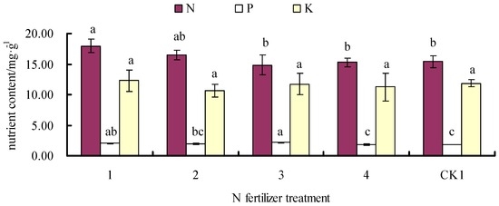 Effects of single N fertilizer application on G. biloba leaf N, P, and K contents in EXP.1.
