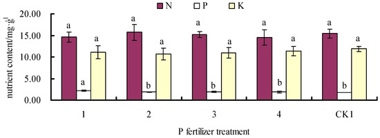 Effects of single P fertilizer application on G. biloba leaf N, P, and K contents in EXP.1.