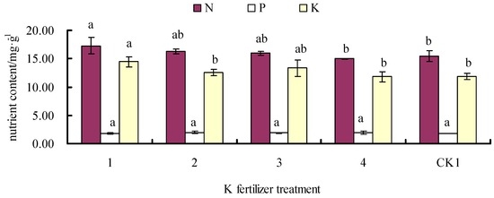 Effects of single K fertilizer application on G. biloba leaf N, P, and K contents in EXP.1.