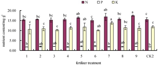 3.3. Effects of Fertilizer on Leaf N, P, and K Contents
