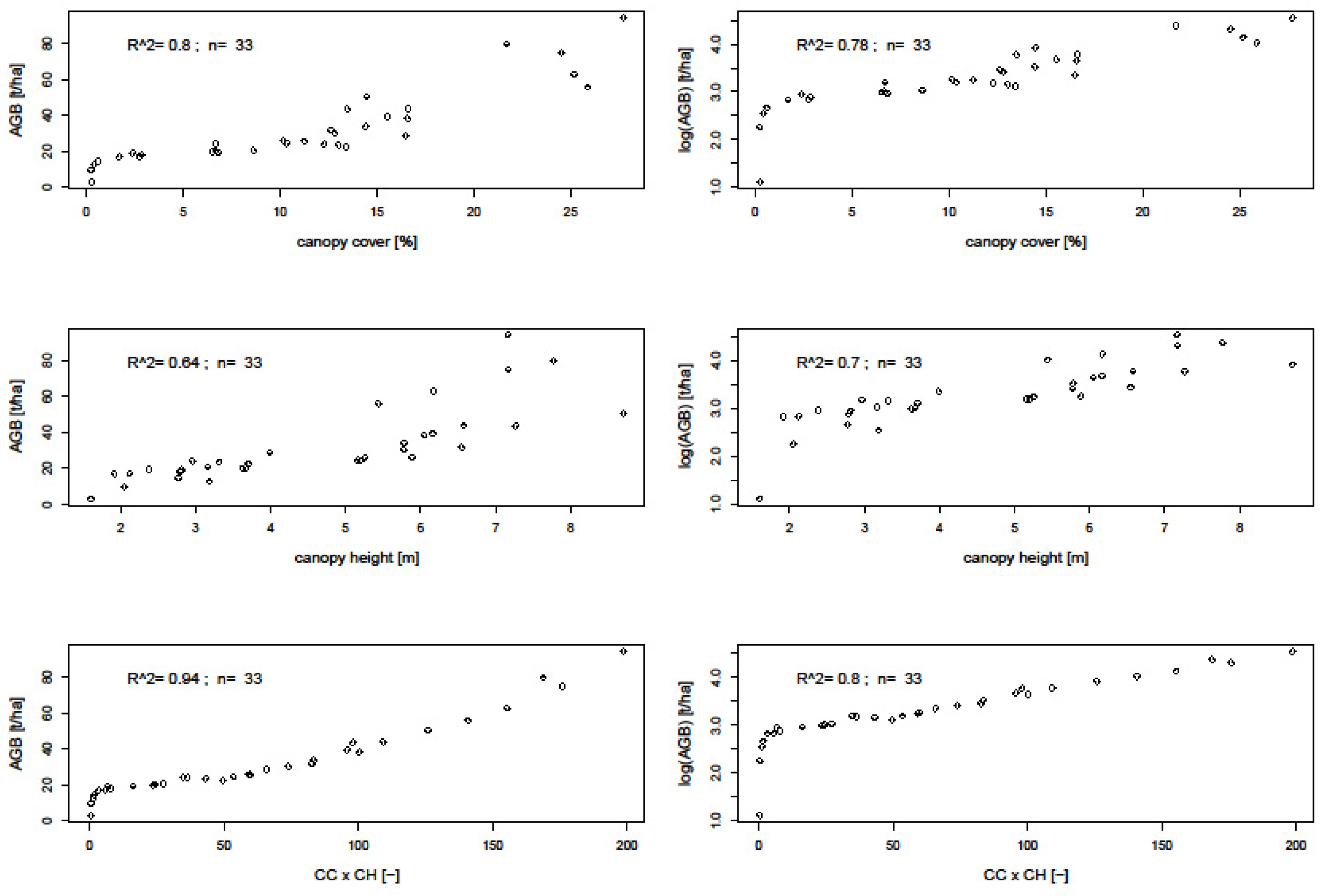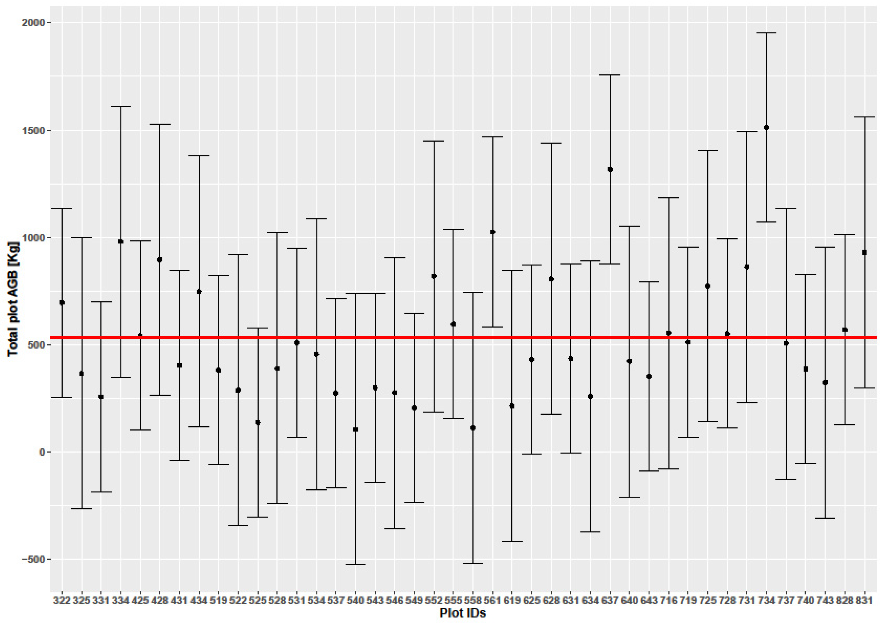 - Nickless, A.; Scholes, R.J.; Archibald, S. A method for calculating the variance and confidence intervals for tree biomass estimates obtained from allometric equations. Afr. J. Sci. 2011, 107. [Google Scholar] [CrossRef]