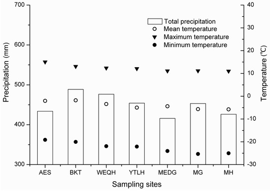 The study was conducted along a latitudinal gradient in eastern Inner Mongolia and Heilongjiang Province of Northeastern China. Tree-ring samples were collected at seven sites: Mohe (MH), Mangui (MG), Moerdaoga (MEDG), Yitulihe (YTLH), Wuerqihan (WEQH), Boketu (BKT), and Aershan (AES), ranging from 120.30° to 122.31° E and 47.27° to 52.66° N (Figure 1). All of the selected stands of Larix gmelinii were naturally established, with no evidence of recent disturbance. To minimize the effects of local terrain and microenvironmental factors on tree growth, the topography of all selected plots was uniform and flat, with an elevation range of 908 m to 1018 m and a southern aspect with the slope ranging from 0 to 20 degrees (Table 1). Further, all sites except AES were located at the peaks of the local mountains. The sampling sites cover almost the entire native latitudinal distribution range of Larix gmelinii in China. The climate in the study region is continental monsoon characterized by a windy spring, a short, warm, and humid summer, and a long, dry, and cold winter. The mean annual precipitation (1960–2013) of the study sites ranged between 415 and 488 mm (Figure 2), with the period between April and September accounting for ~88%–90% of the annual precipitation [23]. The mean annual temperature ranged from −5.8°C to −1.8°C [23]. Soil type varies among the seven sites, being mostly brown coniferous forest soils, chernozem soil, and grey forest soil, with a depth of 8 to 100 cm (Table 1).