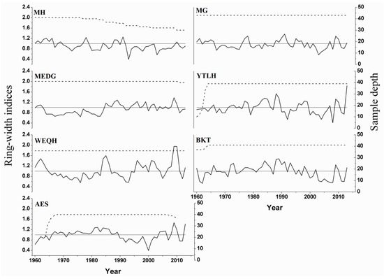 Ring-width residual chronologies for the period 1960–2013 constructed for Larix gmelinii along the latitudinal gradient from 47.27° to 52.66° N at the seven sites (panels) in the Greater Khingan Mountains of the western Chinese boreal forest. The dashed lines indicate the numbers of tree-ring series.