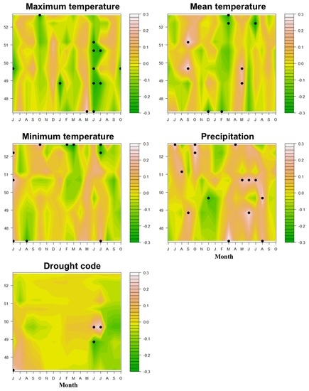 Bootstrapped correlation coefficients between Larix gmelinii residual tree-ring chronologies and the monthly climate variables (monthly maximum, mean, and minimum temperatures, monthly total precipitation, and monthly drought code) for the period 1960–2013 along the latitudinal gradient from 47.27° to 52.66° N in the boreal forest of the western Greater Khingan Mountains in Northeastern China. The black dots indicate significant correlations at the p < 0.05 level.