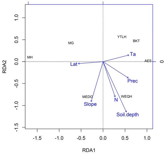 Redundancy analysis (RDA) calculated from the seven residual chronologies, local factors, and the monthly climate parameters for the period 1960–2013. Significant (p < 0.05) environmental factors are indicated by vectors (blue arrows); the longer the vector, the more important the climate parameter. The correlation between the variables is illustrated by the cosine of the angle between two vectors. Vectors at sharp angles indicate a positive correlation, vectors at obtuse angles indicate a negative correlation, and vectors crossing at right angles indicate a near-zero correlation [33]. Ta = annual mean temperature, Prec = annual total precipitation, N = soil organic nitrogen content. Slope = the slope of the sampling point, Soil depth = the depth of the soil layer at the sampling point, Lat = the latitude of the sampling point. MH, MG, MEDG, YTLH, WEQH, BKT, and AES represent the seven sampling sites (i.e., Mohe, Mangui, Moerdaoga, Yitulihe, Wuerqihan, Boketu, and Aershan, respectively).