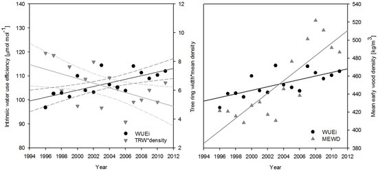 Trends of water use efficiency and tree-ring width multiplied by mean density as an indicator of productivity (left) and mean early wood density (right) over the 15 year investigation period for the Rheinhardsdorf provenance in Hohenleipisch.
