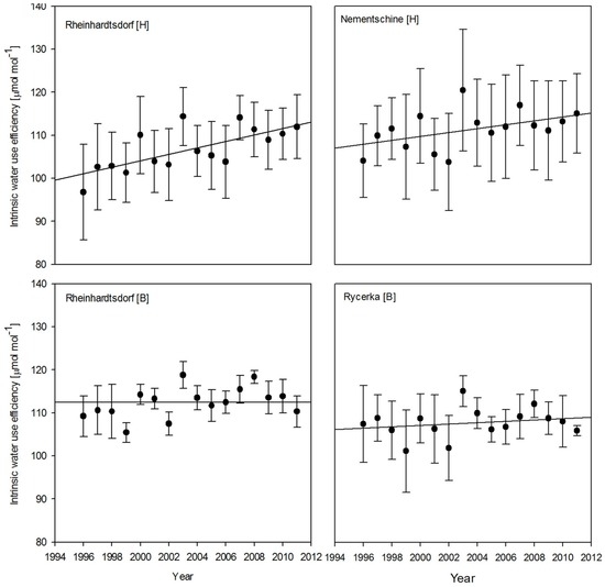 For all four populations, an increase in WUEi over the 15 year investigation period was visible (Figure 2). The increase was strongest for the provenance Rheinhardtsdorf in Hohenleipisch with a significant incline with the linear trend of 0.75 (p < 0.05), and weakest for the provenance Rycerka in Borstendorf (0.16). The provenance Nementschina in Hohenleipisch showed the second highest incline with 0.45 (p < 0.1), while the provenance Rheinhardtsdorf in Borstedorf had the third highest incline (0.33).