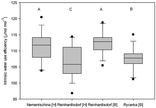 Mean intrinsic water use efficiency of the respective provenances and sites (H = Hohenleipisch; B = Borstendorf); Different letters indicate statistically significant (Bonferroni t-test, p < 0.05) differences.