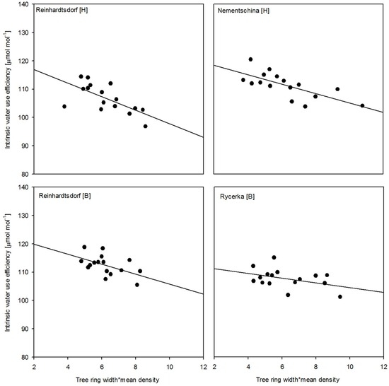 Combining productivity with WUEi in the respective years showed a significant trend (Borstendorf: p < 0.05 and Hohenleipisch: p < 0.01) at both sites for the Reinhardtsdorf provenance. The trend for the Nementschina provenance was also significant (p < 0.01). The only provenance with an insignificant trend was Rycerka (Figure 4), thus showing the linkage between low productivity and an increase in WUEi. Focusing on known drought years, e.g., 2003, the increased WUEi in the respective year, followed by a decline in the following year (2004) expressed the fast and specific response to drought stress.