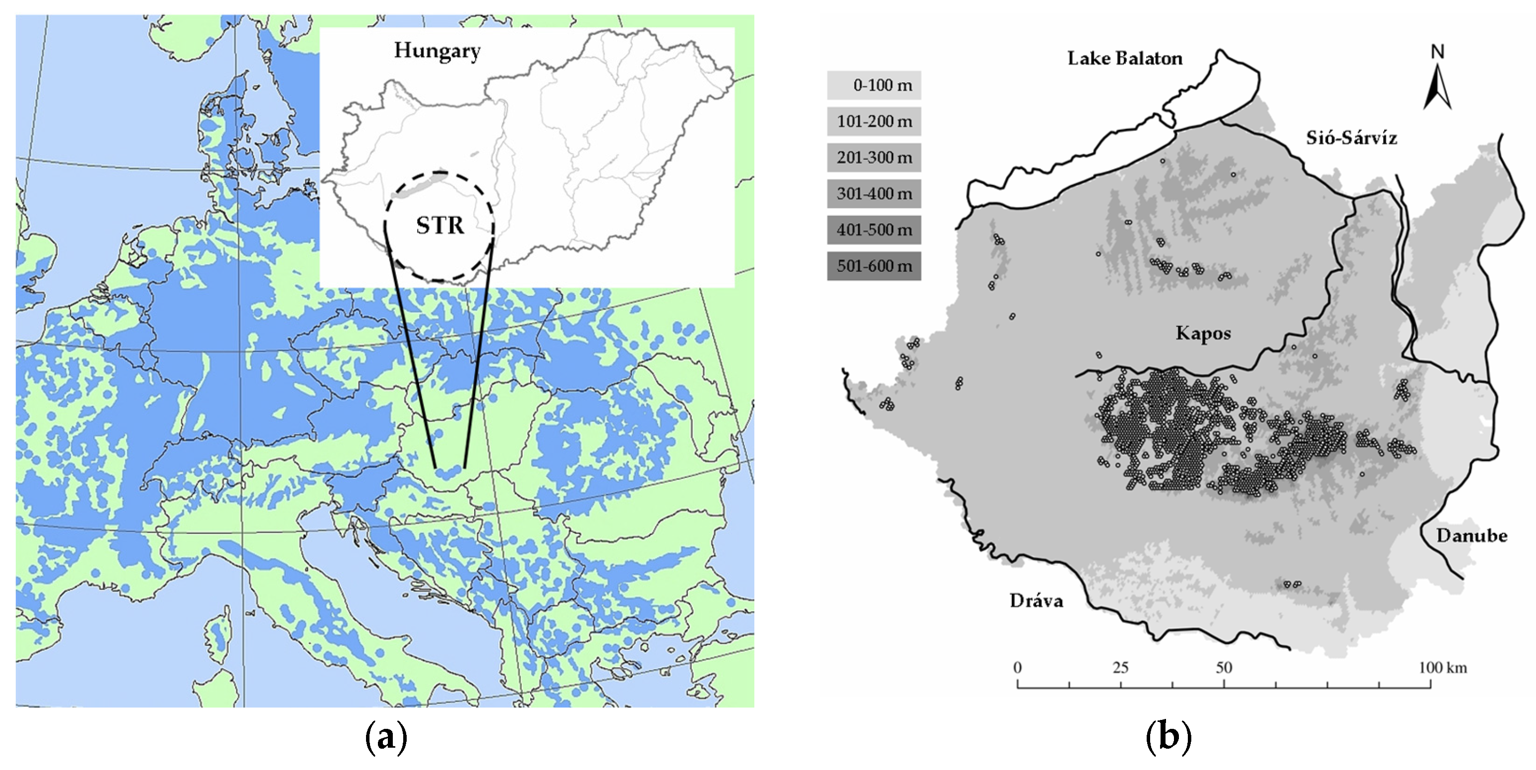 Location and characteristics of the investigation area. (a) Southern Transdanubian region in Central Europe (STR; Hungary) with the continental scale distribution of European beech (blue patterned area) [37]; (b) Regional geographic surface with the four main rivers and Lake Balaton (inland watercourses are not illustrated); distribution pattern of the studied beech forests (filled circles); and indication of the altitudinal zones (ranges in the upper-left corner).