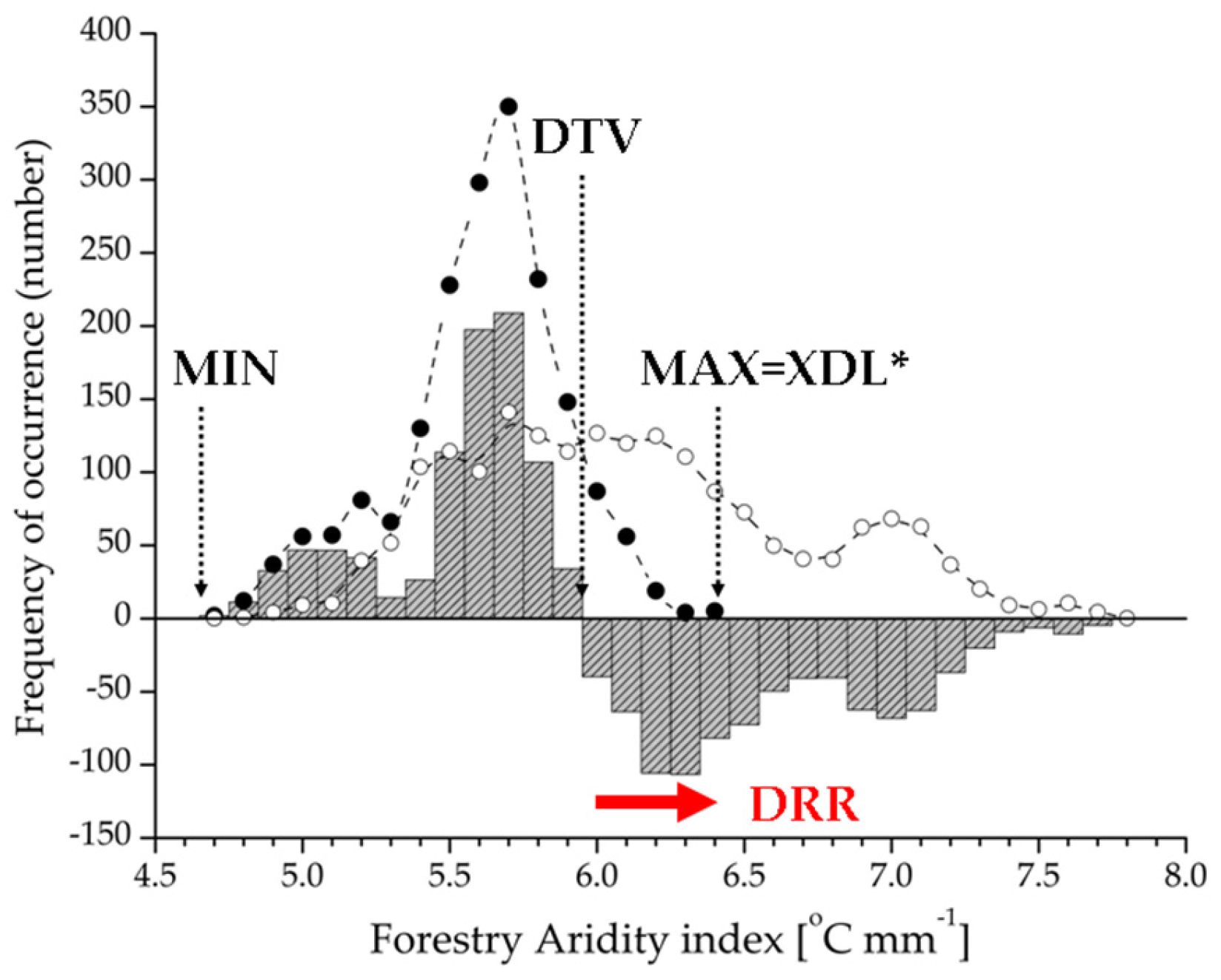 Calculation method for climate function estimation of beech forest distribution by Forestry Aridity index as a sample. Drought Response Range (DRR; red arrow) was extracted from climate response profile (grey bars), the profile was derived as the difference of observed (filled circles) and expected frequency (open circles) of beech forest occurrence. The DRR represents the climate limitation function of the distribution, meaning the difference between Drought Threshold Value (DTV) and Xeric Distribution Limit (XDL). DTV is the value of the bioclimatic variable if the observed frequency is equal with the expected frequency, and this is also interpreted as the initial threshold for the DRR. * XDL is identical with the maximum (MAX) if the high value of the variable represents a climate limitation range; otherwise it is equal with the minimum (MIN).
