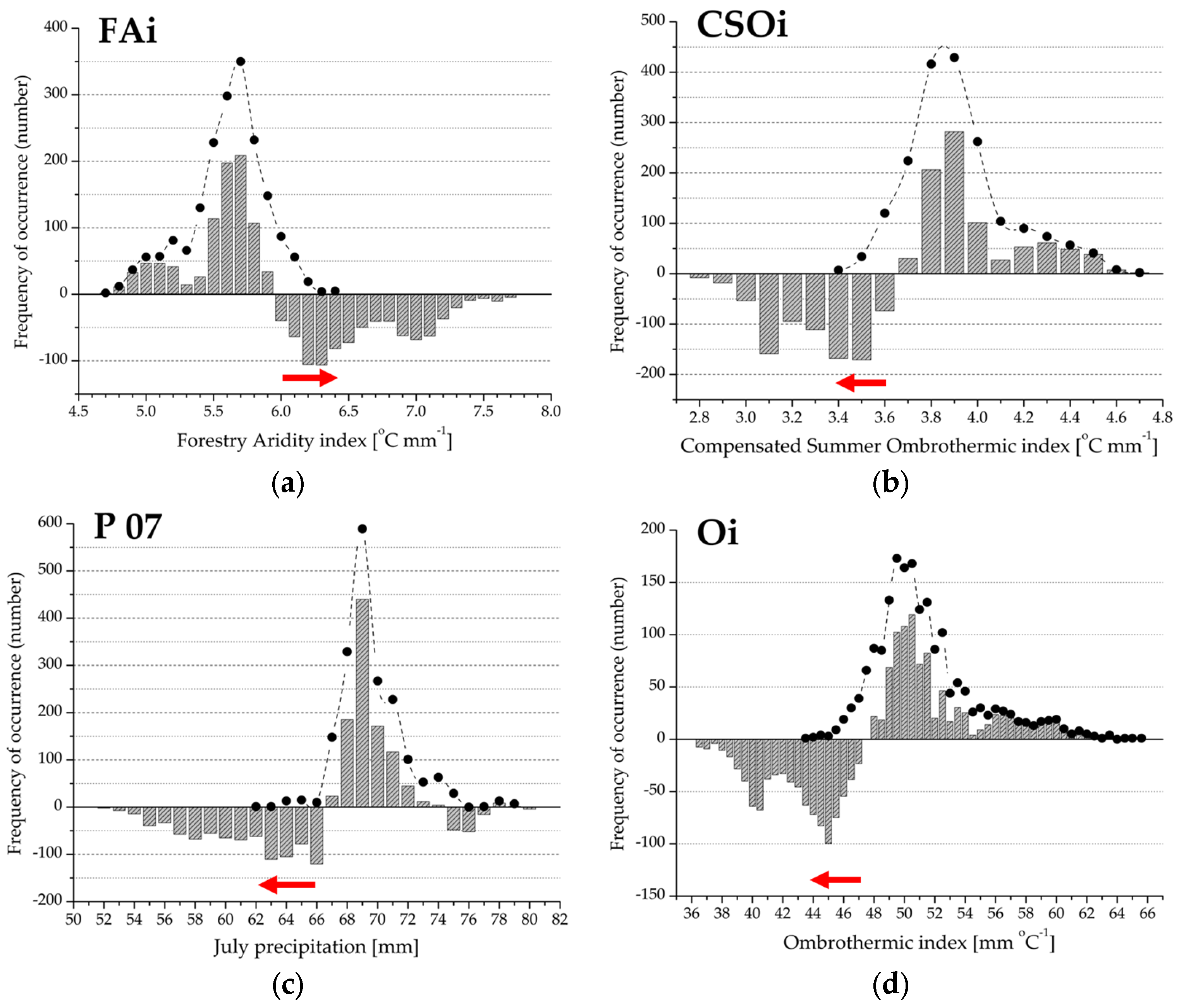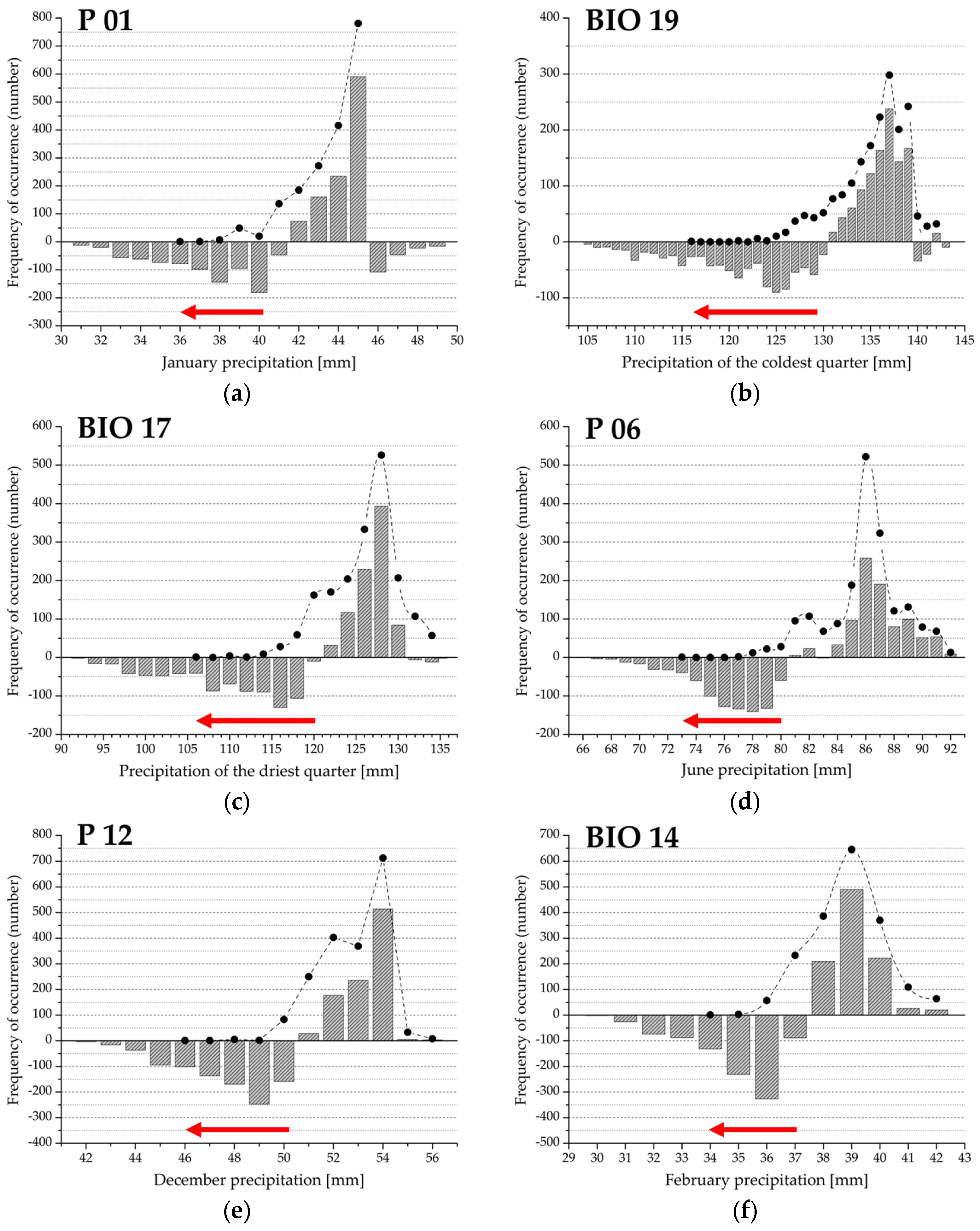 (a–f) Drought Response Range (DRR; red arrow) and the regional climate response profile (grey bars) for the variables extracted in the second principal component. The histograms represent the difference between observed and expected frequency; positive values indicate climate preference range; negative values refer to the climate limitation function of beech forest distribution. Filled circles denote observed frequency of occurrence, absence data are not shown. See also Figure 2 and Table 1.