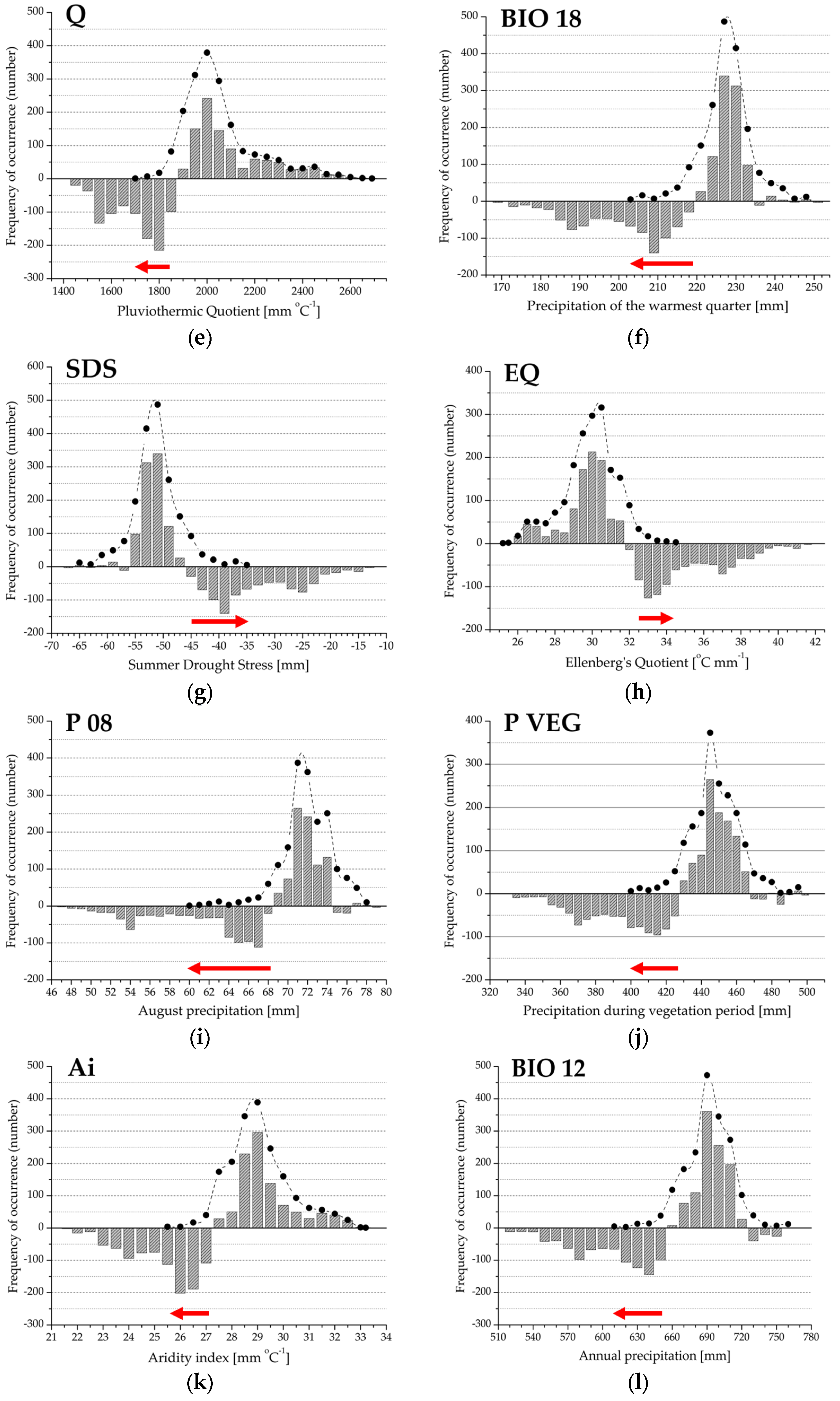 (a–l) Drought Response Range (DRR; red arrow) and the regional climate response profile (grey bars) for the variables extracted in the first principal component. The histograms represent the difference between observed and expected frequency; positive values indicate climate preference range; negative values refer to the climate limitation function of beech forest distribution. Filled circles denote observed frequency of occurrence, absence data are not shown. See also Figure 2 and Table 1.
