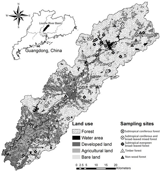 The Liuxihe River basin, located in northern Pearl River Delta, southern China, is an important source of drinking water for Guangzhou (Figure 1). The main river is approximately 171 km long, and the basin covers an area of approximately 2300 km2. It has a subtropical monsoonal climate, with an average annual temperature, precipitation, and relative humidity of 22.7 °C, 1727 mm, and 76.6%, respectively. The topography of its upstream area comprises mostly hills and streamlets, and plains and hills are found in its middle and lower reaches. Soil parent materials are mainly granite, quartz, and sandshale, and the soil classification mainly includes yellow ferralsols, latosols, and paddy soil. The Liuxihe Reservoir is located in the middle reach of the basin.