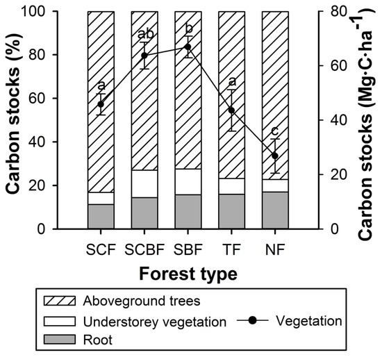 The SBF had the highest vegetation C stock (66.86 ± 3.99 Mg·C·ha−1) out of all measured forest types (Figure 2). The vegetation C stock of the NF (26.78 ± 6.27 Mg·C·ha−1) was significantly lower than those of other forest types (ANOVA, p < 0.05). By comparing the variations in C stocks, the standard errors of the secondary forests (SBF: 3.88, SCBF: 4.91, SCF: 3.99) were lower than those of the TF (7.62) and NF (6.27). This could imply that the secondary forest communities are more similar in terms of their biomass than the planted forests. In all forest types, the aboveground trees always contributed the highest C stocks, compared to the roots and understory vegetation. Especially for SCF, the C pools of aboveground trees occupied a total vegetation C stock as high as 83.21%. Regarding the comparison of the root C pool and understory vegetation C pool among different forest types, NF and SCBF accounted for the highest proportions (17.01% and 12.59%), respectively.