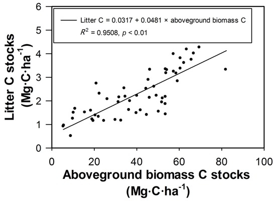 A linear regression model (R2 = 0.9508, p < 0.01) in Figure 4 was derived from forest inventory data and statistical analysis. The regression results showed litter C stocks had a strong positive linear dependence relation with the aboveground biomass C stocks of the measured forests.
