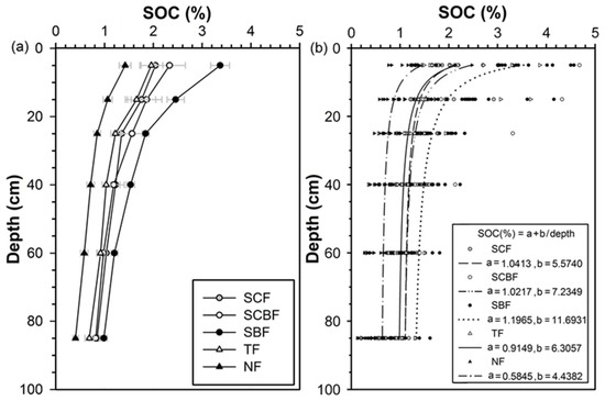 The soil samples for SOC contents (%) determination were taken from the soil profile at six depth levels: 5 (0–10), 15 (10–20), 25 (20–30), 40 (30–50), 60 (50–70), and 85 (70–100) cm. The SBF had the highest SOC content (3.37%) at 5 cm depth out of all measured forest types (Figure 5a). The vertical SOC contents distributions in the soil profiles were modeled by the formula SOC (%) = a + b/depth (Figure 5b) for the different forests. The fitting equations revealed how SOC contents varied with soil depth, and they modeled the SOC contents at any depth. The results showed that the differences in the SOC contents in the upper soil levels were greater than those in the lower levels. The lowest average SOC content was 0.42% from NF, at the depth of 85 cm.