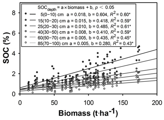where y is the soil depth and x is the coefficient of the regressive model. The equation revealed that the effect of aboveground biomass on SOC gradually decreases with increasing soil depth.