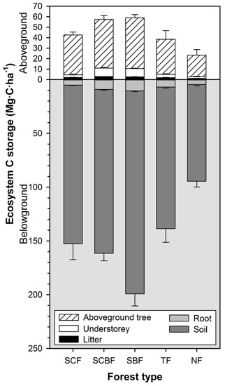 The vegetation C stocks of natural secondary forests in this study were less than other studies performed in the same climatic zone [55,56]. For example, two research studies reported that the Dinghushan Biosphere Reserve, which is in the same climatic zone as Liuxihe River basin, had a large number of natural primary forests and even more over-mature forests [55,56]. They presented the vegetation C stocks of the subtropical coniferous and broad-leaved mixed forest and subtropical evergreen broadleaved forest to be, respectively, 123.04 and 89.75 t·ha−1, values which are both higher than those measured in our study (63.68 and 66.86 t·ha−1). The vegetation C stock of the SBF reached as high as 66.86 Mg·C·ha−1, which was 1.54- and 2.50-fold greater than those of the TF and NF, respectively, and 1.46- and 1.05-fold greater than those of the SCF and SCBF, respectively. This suggests that natural secondary forests that experience typical subtropical forest community succession supply greater vegetation C sequestration services than planted forests. This is in agreement with the results of previous studies of subtropical forests [55,56]. In accordance with similar results [57,58], generally, the contribution of understory C pools was smaller than those of aboveground trees and roots. Nevertheless, the understory vegetation could provide both biomass production and biodiversity benefits [59], as well as improved soil properties [60,61]. Many studies have shown that the proportion of biomass and C stocks in the understory vegetation is a significant part of annual nutrient and forest ecosystem C cycling [62,63]. The results showed that failing to account for C stocks in understory vegetation would lead to a 5%–14% underestimate of the total vegetation C in natural secondary forests and a 5%–10% underestimate in planted forests.