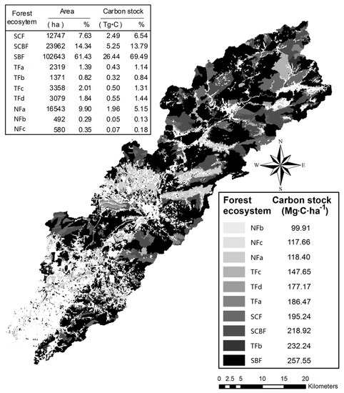 The estimate of the total forest C stock in the Liuxihe River basin was calculated to be 38.04 Tg·C. On the whole, the natural secondary forests provided a considerable fraction of the total C stock, as they accounted for 34.17 Tg·C (89.82%) of the entire basin forest C pool, with the SCF, SCBF, and SBF accounting for 6.54%, 13.79%, and 69.49%, respectively, of the total C stock. The C stock of the planted forests accounted for 3.87 Tg·C (10.18%) of the total C stock, with the TF and NF accounting for 4.72% and 5.46%, respectively, of the total C stock. Although the total natural secondary forest C stock was more than eight times that of the planted forests, the planted forests’ C pool should not be neglected, as it accounted for 10% of the forest C and constituted 16.65% of the forest area.
