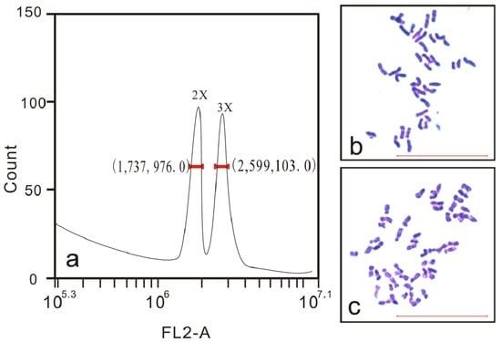 Ploidy level detection of offspring derived from GT1. (a) Flow cytometric analysis of diploid and triploid; (b) Chromosome number of diploid (2n = 2x = 36); (c) Chromosome number of triploid (2n = 3x = 54). Scale Bar = 50 μm.