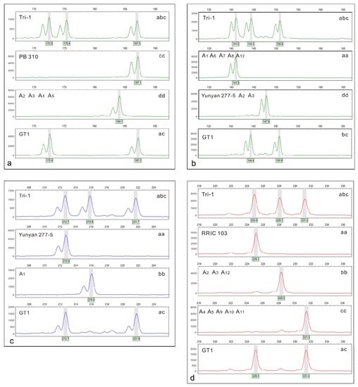 Alleles configurations of Tri-1, candidate male parents and GT1 for markers RUB 183, RUB 184, RUB 156 and RUB 199. (a) Marker RUB 183, alleles ‘abc’, ‘cc’, ‘dd’, ‘ac’ were amplified in Tri-1, PB 310, A2-A5 and GT1 respectively; (b) Maker RUB 184, alleles ‘abc’, ‘aa’, ‘dd’, ‘bc’ were amplified in Tri-1, (A1, A6-A8, A12), (A2, A3, Yunyan 277-5) and GT1 respectively; (c) Marker RUB 156, alleles ‘abc’, ‘bb’, ‘aa’, ‘ac’ were amplified in Tri-1, A1, Yunyan 277-5 and GT1 respectively; (d) Marker RUB 199, alleles ‘abc’, ‘cc’, ‘bb’, ‘aa’, ‘ac’ were amplified in Tri-1, (A4, A5, A9-A11), (A2, A3, A12), RRIC 103 and GT1 respectively.