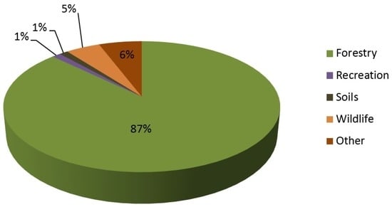 Several surveys have been conducted in the last 30 years regarding different aspects of GIS education in forestry and natural resource management [,,,]. Basic skill requirements of entry-level foresters with respect to GIS were first suggested over twenty years ago in a report to the Society of American Foresters [], yet periodic reassessment is of value to educational programs. The intent and purposes of these reports and surveys are to assess the capabilities of the educational systems and to assess the needs of employers and employees. Similar recent surveys, albeit from other fields, have assessed the uses of GIS by land use planners [], fisheries management agency administrators [], health service professionals [], and primary school teachers []. In general, a lack of training and limited time available during the work day have been noted as reasons for different levels of use of GIS [,].