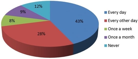 A survey [] from a decade ago indicated that approximately 43% of recent graduates who were working in natural resource fields used GIS either every other day or once a week. In the current survey, 71% of respondents noted that they use GIS every day or every other day (Figure 2). Specifically, 43% of all respondents indicated that they used GIS applications every day, 28% used GIS applications every other day, yet 9% indicated that they only used GIS applications once a month. These compare with 21%, 22%, and 15%, respectively from the previous survey. However, in the current survey 12% of respondents indicated that they never used GIS in their current position. This compares to 20% in the previous survey. Of those respondents that indicated that they had been in their positions for four or more years (n = 9), 6% of respondents used GIS either every day or every other day. None of these respondents indicated that they never used GIS. For respondents that had been in their position for four years or less (n = 77), approximately 65% used GIS every day or every other day. Approximately 15% of these respondents never used GIS.