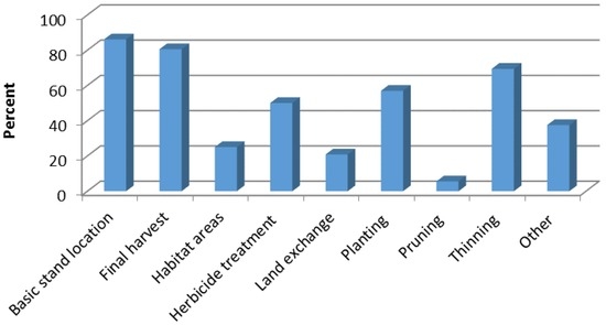 Basic stand location and final harvest maps were identified as the most commonly created maps or datasets by all survey respondents (Figure 3). Other commonly created maps or datasets were associated with planting, thinning, and herbicide treatment purposes, all useful for on-the-ground management of forests. Thirty-eight percent of all respondents indicated that they developed other datasets or maps than the examples provided in the survey. Examples of these included maps supporting timber cruises, stand exams, other types of timber sales, prescribed burns, and concerns over wetlands and other water bodies.