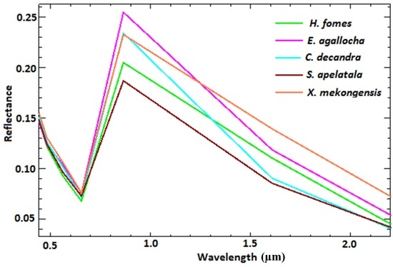 Spectral profile of various mangrove species. All five mangrove species show similar reflectance patterns in the lower wavelengths of the spectrum. In contrast, reflectance patterns are different in the higher wavelengths of the spectrum. To be more specific, the spectral profiles of the five mangrove species follow each other between the wavelengths of 0.5 and 0.7 µm. The reflectance patterns become different after 0.7 µm, and this difference is maintained for the remaining portion of the spectrum.