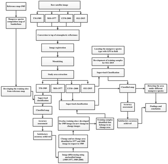 On the basis of spectral signature-based satellite image classification, identification and distribution of mangrove species were analyzed in this study. A handheld GPS was used to collect the training sets for different mangrove species from the field, and collected GPS locations of various mangrove species were overlaid on satellite images from 2015 to extract the spectral signature. To classify the imagery of 1977, 1989 and 2000, training sites were developed from the reference map, and spectral signatures were generated for different mangrove species. Afterwards, extracted spectral signatures were used for image classification and identification of mangrove species. In addition to supplementary information obtained from various sources, the author’s prior knowledge was also used to document characteristics of different mangrove species, as supported by Kumar and Ghosh [58]. There are 27 mangrove species in the Sundarbans [15], but many of these are present in small quantities, spread over wide areas in small patches and thus unable to be detected using medium-resolution satellite data. Hence, we mapped the five major mangrove species of the Sundarbans in this study, named Heritiera fomes, Excoecaria agallocha, Ceriops decandra, Sonneratia apelatala and Xylocarpus mekongensis. The remaining species were classified under the major five mangrove species on the basis of dominance. The spectral profiles of five species, H. fomes, E. agallocha, C. decandra, S. apelatala and X. mekongensis, are shown in Figure 2. The five major species were selected based on the information obtained from previously published literature [15,29,35,59] and species-level maps of the Sundarbans. Figure 3 shows the workflow for image processing and change detection.