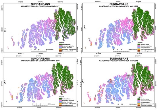 The Sundarbans mangrove forest is an important resource for the people of the Ganges Delta. It plays an important role in the local as well as global ecosystem by absorbing carbon dioxide and other pollutants from air and water, offering protection to millions of people in the Ganges Delta against cyclone and water surges, stabilizing the shore line, trapping sediment and nutrients, purifying water, and providing services for human beings, such as fuel wood, medicine, food, and construction materials. However, this mangrove ecosystem is under threat, mainly due to climate change and anthropogenic factors. Anthropogenic and climate change-induced degradation, such as over-exploitation of timber and pollution, sea level rise, coastal erosion, increasing salinity, effects of increasing number of cyclones and higher levels of storm surges function as recurrent threats to mangroves in the Sundarbans. In this situation, regular and detailed information on mangrove species composition, their spatial distribution and the changes taking place over time is very important for a thorough understanding of mangrove biodiversity, and this information can also lead to the adoption of management practices designed for the maximum sustainable yield of the Sundarbans forest resources. We employed a maximum likelihood classifier technique to classify images recorded by the Landsat satellite series and used post classification comparison techniques to detect changes at the species level. The image classification resulted in overall accuracies of 72%, 83%, 79% and 89% for the images of 1977, 1989, 2000 and 2015, respectively. We identified five major mangrove species and detected changes over the 38-year (1977–2015) study period. During this period, both Heritiera fomes and Excoecaria agallocha decreased by 9.9%, while Ceriops decandra, Sonneratia apelatala, and Xylocarpus mekongensis increased by 12.9%, 380.4% and 57.3%, respectively.
