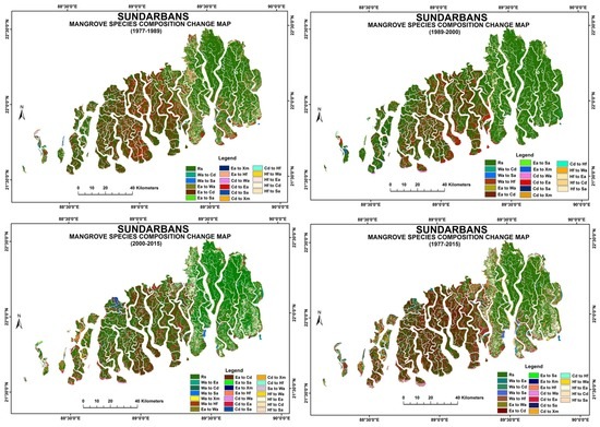 Spatiotemporal distributions of different mangrove species of the Sundarbans are shown for the years 1977, 1989, 2000 and 2015 in Figure 4, and statistics regarding species composition are shown in Table 2. Details of the detected change in the mangrove species composition in the study area are summarized in Table 3, and the change matrix is shown in Table 4.