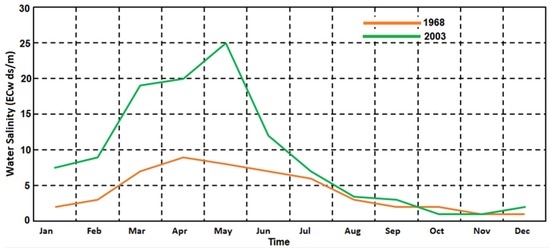 Analysis of mangrove species composition change in the Sundarbans mangrove forest shows that the areas under H. fomes and E. agallocha decreased during the study period. In contrast, the area under C. decandra, X. mekongensis and S. apelatala increased during the last 38 years. Different natural forces, such as cyclones, coastal erosion and accretion, naturally shifting hydrology, changing climate and sea level rise, have adverse effects on the Sundarbans mangrove forest (see Table 5 for the underlying mechanism of the impact of these natural forces). Increasing water salinity and immersed areas in coastal regions as a result of changing climate are set to affect the ecosystem of the Sundarbans mangrove forest. As a result, a wide range of impacts is anticipated in the Sundarbans. The availability of freshwater, water salinity, variation in drainage and the siltation process have a substantial influence on the spatial distribution of mangrove species in the Sundarbans [16]. Chaffey and co-authors [29] divided the Sundarbans mangrove forest into three ecological zones: (a) freshwater or oligohaline (north-eastern part, the dominant species is H. fomes); (b) moderately saline or mesohaline (middle southern part, the dominant species is E. agallocha) and (c) saline or polyhaline (southern part, the dominant species is C. decandra). During the last four decades, salinity has increased in the Sundarbans region. For instance, Islam and Gnauck [65] analysed the time series salinity data of the Passur River-Mongla point and reported that the salinity rate was <10 ds/m in 1968 during the dry season, while in the same season in 2003, the highest salinity rate was 25 ds/m (see Figure 6 for details). Therefore, a large variation has been observed in salinity levels during the time period of 35 years. As a consequence of increasing salinity in the Sundarbans, mesohaline areas are transforming into polyhaline areas, especially in the western and south-western parts of the forest. On the other hand, oligohaline areas are transforming into mesohaline areas. Karim [66] found approximately 60% of the western part was polyhaline, about 35% was mesohaline and less than 5% was oligohaline. Following the transformation of the ecological zones, new tree species that are more adapted to habitats with more salinity have encroached the areas that were previously occupied by other species.