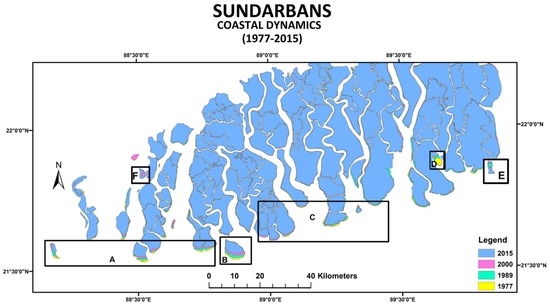 Along the Sundarbans coastline, retreat is evident everywhere, but large areas of erosion have been observed in the south and south-western parts (sites A, B and C in Figure 7) during the study period. In contrast, small islands are currently forming at the mouth of Baleshwar, Bhanba and Haringhata Rivers (sites D, E and F in Figure 7). The highest coastal retreat was observed around the Bhangadhuni Island (site B) with an average annual rate of 66 m/year between 1977 and 2015, and this finding is consistent with the reported result of Rahman and co-authors [70]. Different anthropogenic and natural forces play a detrimental role in increasing the coastal retreat of the Sundarbans coast, which increases the vulnerability of mangroves [3]. On the other hand, accretion of the Sundarbans coast plays an active role in the increment of the areal extent of mangrove forests and also in mangrove species composition dynamics. Most of the newly accreted islands are afforested by salt-tolerant S. apelatala trees in the preliminary stage, and this helps advance the sedimentation process. This is one of the major influential factors behind the observed changes in the area under S. apelatala trees in the Sundarbans mangrove forests during the study period.