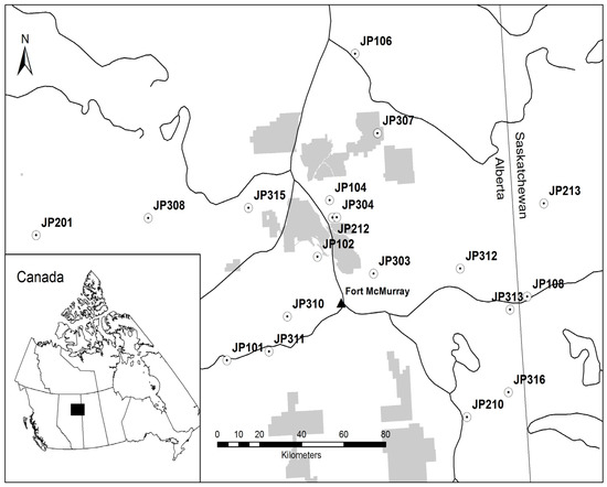 Map of study site location in northeastern Alberta, Canada, showing the 19 sampling sites where foliage samples were collected in 2011. The grey shaded areas represent active mining operations as of 2013. Main operations are centered near JP212 and JP102.