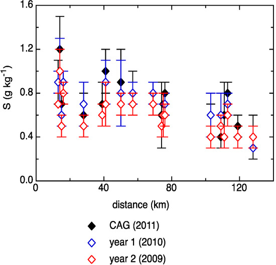 The total sulfur contents in jack pine needles were similar to total S contents in spruce and pine needles observed in northern conifer stands in Finland [40]. Younger leaves are more sensitive to atmospheric SO2 concentrations compared to older ones [25], as reflected by slightly higher (SO4-S)/(Sorg) ratios in younger pine needles (Table 2). Jaques and Legge [33] determined the following (SO4-S)/(Sorg) ratios indicative for certain sulfur loading levels in the AOSR: <0.12: background levels; 0.12–0.19: low levels; 0.19–0.25: moderate levels; 0.25–0.35: moderately high levels; 0.35–0.45: high levels; and >0.45: very high levels of S loading. According to this classification, none of the sites are indicative of high levels or very high levels, but also none of the CAG needles were representative of what is considered background levels for S loading. Seven of the sites show moderately high levels, six sites moderate levels and the remainder are indicative of low levels of S loading (Table 2). Although none of the sites show (SO4-S)/(Sorg) ratios of environmental concern, the increase of TS towards the emission sources demonstrates that industrial S is taken up by jack pine stands. (SO4-S)/(Sorg) ratios reported for 2008 CAG jack pine needles [24] were in the same range as the 2011 CAG ratios found in this study (Figure 5), demonstrating no recent changes. We conclude that the investigated jack pine stands in the AOSR show currently no significant signs of sulfur stress resulting from elevated sulfur loadings and deposition rates as demonstrated by generally low to moderate (SO4-S)/(Sorg) ratios, but that further monitoring is warranted.
