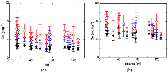 Considering all sampling sites, calcium concentrations increased with needle age from 2.40 ± 0.73 g·kg−1 (CAG), 4.35 ± 1.31 g·kg−1 (year 1), to 5.38 ± 1.58 g·kg−1 for year 2 needles (r = 0.69, but p = 0.06). Site averaged Ca concentrations decreased with distance (r = −0.59, r = −0.62, r = −0.64 for CAG, year 1, and year 2 needles; p < 0.05, Figure 3a). The highest site average of 4.01 ± 1.54 g·kg−1 was measured at JP104 (14 km), the lowest (1.82 ± 0.39 g·kg−1) at JP101 (69 km).