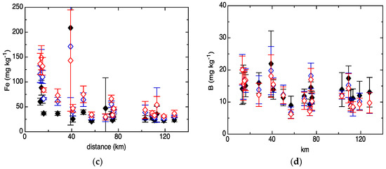 Boron contents ranged from 4.1 to 40.2 mg·kg−1 with the highest value reported for CAG needles. Boron contents averaged 13.5 ± 4.7 mg·kg−1 for CAG, 12.9 ± 5.1 mg·kg−1 for year 1, and 12.5 ± 4.9 mg·kg−1 for year 2 needles. Similar to Fe, only year 1 and year 2 needles correlated significantly with distance, with r = −0.62 and −0.64, respectively (p < 0.05; Figure 3d).