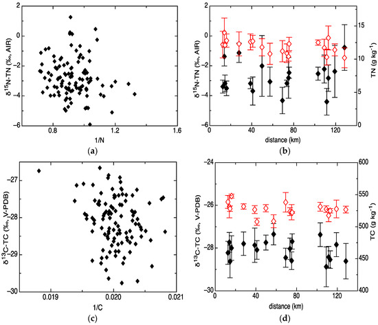 Nitrogen and carbon isotope results from the CAG pine needles. (a) δ15N values of total nitrogen (TN) versus the inverse TN (wt %) content; (b) site averaged δ15N values (black diamonds) and TN values (red diamonds) versus distance to the major emission sources in the AOSR; (c) δ13C values of total carbon (TC) versus the inverse TC (wt %) content; (d) site averaged δ13C values (black diamonds) and TC values (red diamonds) versus distance to the major emission sources in the AOSR.
