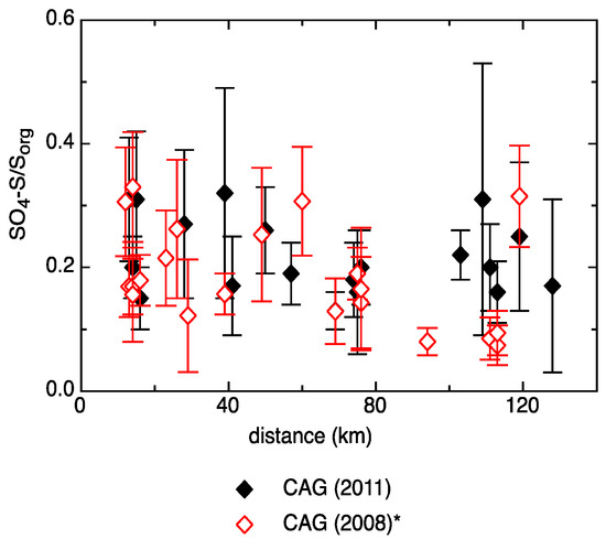 Site averaged SO4-S to Sorg ratios for CAG needles (2011, this study) in comparison to 2008 CAG ratios of jack pine needles (* data from [24]) versus distance to the main oil sands operations.