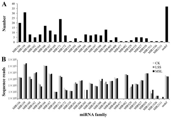 - Zhu, J.; Li, W.; Yang, W.; Qi, L.; Han, S. Identification of microRNAs in Caragana intermedia by high-throughput sequencing and expression analysis of 12 microRNAs and their targets under salt stress. Plant Cell Rep. 2013, 32, 1339–1349. [Google Scholar] [CrossRef] [PubMed]