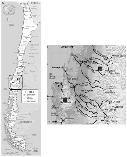 Map of Chile (A) and location of the Biobío and Araucanía Regions (insert); (B) location of Los Pellines and Chanleo Sectors (upper and lower white-dotted squares, respectively) [].