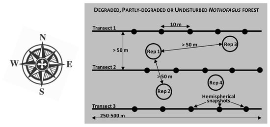In the field, at both geographic locations, for every forest degradation class that was aerially located with GPS, we followed three parallel transects (250–500 m length, 50 m spacing, with a total of nine per site) with an East-West orientation (Figure 2) in order to ascertain the changes in stand density and degrees of erosion that were initially observed from the air, and to assess any important variations in the actual number of tree species. The vegetation was characteristically Nothofagus obliqua Mirb. (Oerst), with or without the presence of N. nervosa P. et E. (Oerst.) as influenced by the slope aspect. Baseline information about the study areas is provided in Table 1. Depending on the level of degradation and location, accompanying tree species included Aristotelia chilensis (Mol.) Stuntz, Citronella mucronata (Ruiz et Pav.) D. Don, Cryptocarya alba (Mol.) Looser, Drimys winterii J.R. et G. Forster Gevuina avellana Mol., Laurelia sempervirens (Ruiz et Pav.) Tul., Lomatia hirsuta (Lam.) Diels ex Macbr., L. dentata (Ruiz et Pav.) R. Br., Luma apiculata (DC.) Burret, Nothofagus dombeyi Mirb. (Oerst), Persea lingue (Ruiz et Pav.) Nees, and Podocarpus saligna D. Don. In the Andes, the number of tree species varied from 1–5 and 6–8 in DEF and PDF, respectively, while it reached 12 species in UNF; whereas in the Coastal forest, the number of species ranged between one to three and four to six in DEF and PDF, respectively, and reached 14 species in UNF. Additionally, in the more degraded forest, the larger the area of bare soil that is exposed to rain and wind erosion has resulted in the formation of small gullies, especially in the Coastal mountains.